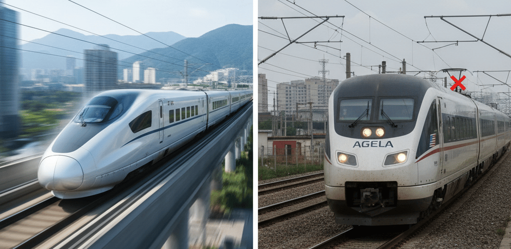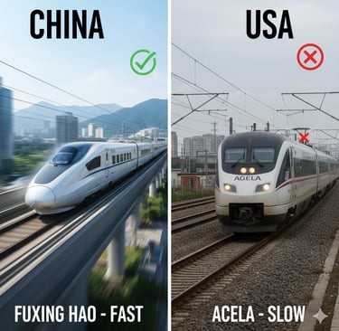 Both nations represent two different visions of progress — China building futuristic train networks that connect cities like veins of innovation, and the USA still debating how fast the future should move.